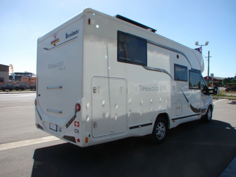 Motor Home: European manufactured by Benimar, 4 Berth including 2 x singles or makes to king bed + drop down double bed, many extras including - 3 cooking hobs, grill with oven, microwave oven, 3 way fridge freezer (134L), gas/electric hot water, roof mounted solar panels (600w), Victron controller, 2 x on board batterys, gas/electric room heater, LED lighting throughout, 12v LED Television, fresh water tank (120L), grey water tank (105L), separate shower, separate cassette toilet, hand basin, wind-out awning, huge rear garage, curb side entrance, green cert self contained, superb condition, a credit to its previous one owner.